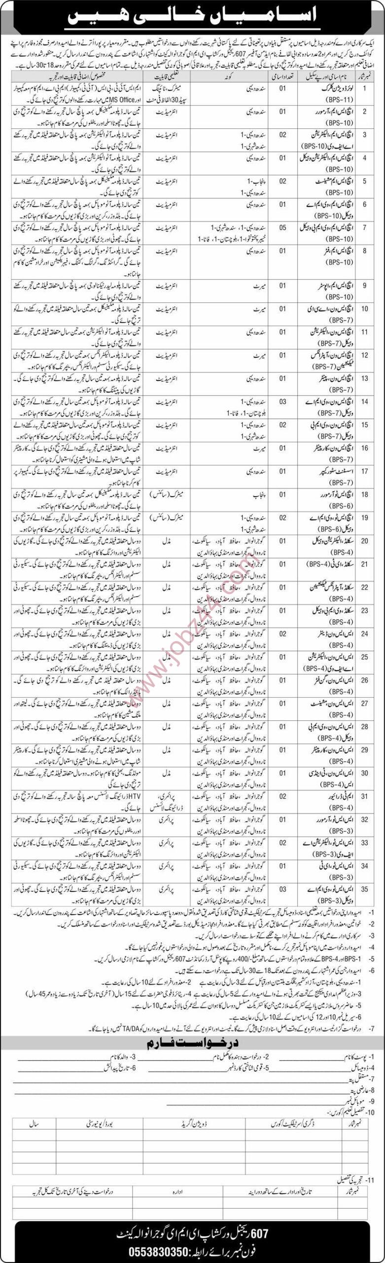 607 Regional Workshop EME Gujranwala Pun, Pakistan 2025New Govt Jobs Announcement Full Time