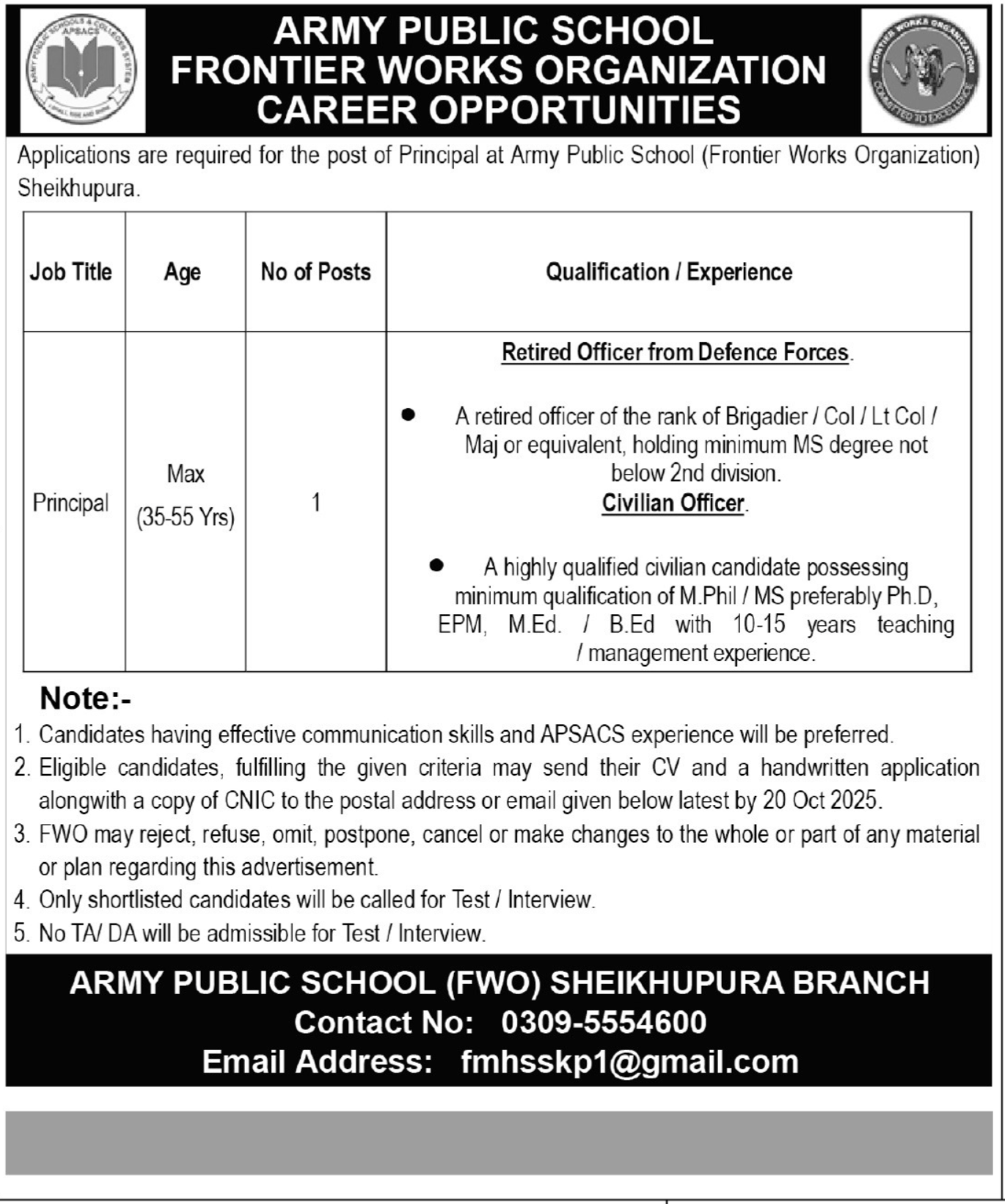 To apply for these jobs at Frontier Works Organization FWO Sheikhupura Lahore, Punjab, in Pakistan, you must: