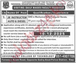 If you are looking for govt jobs 2025, this is a great chance for you. The Government College of Technology Rawalpindi in Punjab, Pakistan has announced new govt jobs 2025 for skilled and motivated people. These are official government jobs and offer good benefits, job security, and a safe work environment. Many people searching for jobs near me, government jobs 2025, or new jobs 2025 will find this listing helpful.