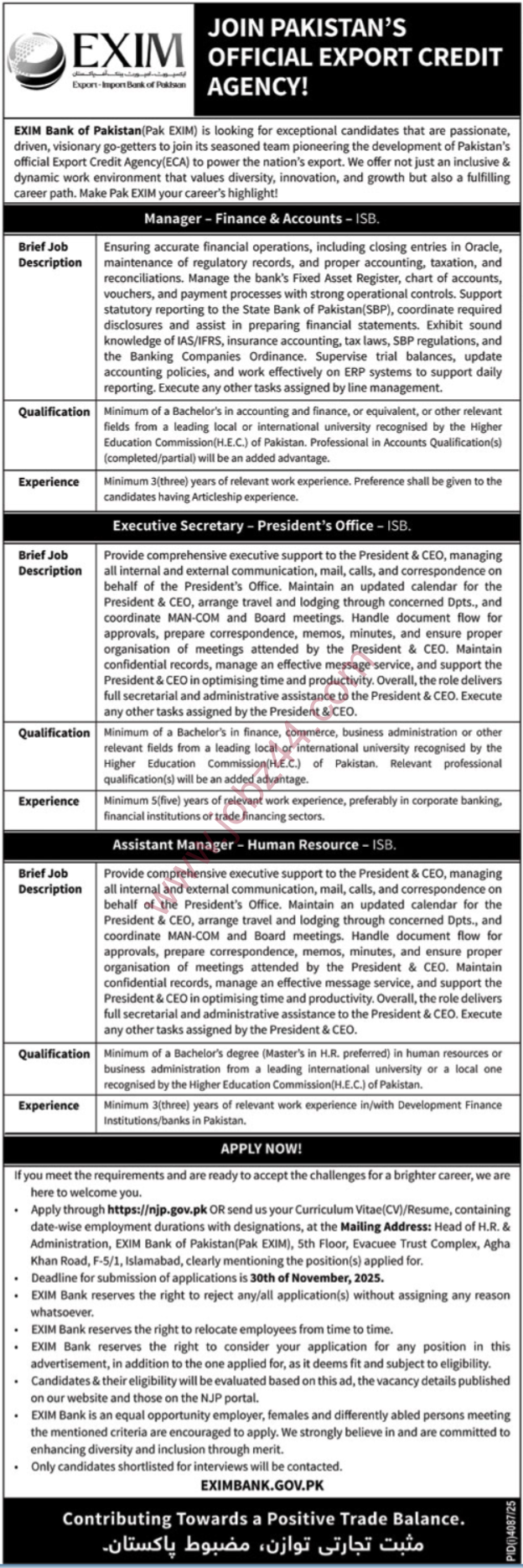 Job Listing 2025: Careers at Exim Bank of Pakistan Islamabad Full Time