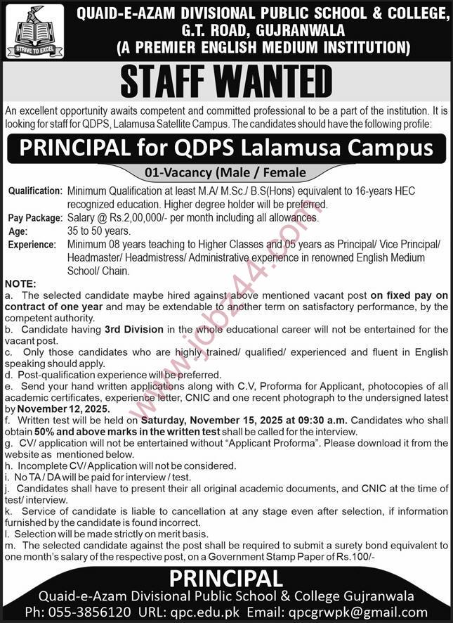 Login to Send MessageQuaid-e-Azam Divisional Public School & College in Lalamusa, Punjab, Pakistan is a well-known and respected educational institution. We serve students from junior to higher secondary levels and believe in quality education, dedication, and growth. This is one of the exciting government jobs 2025 being offered at our campus.