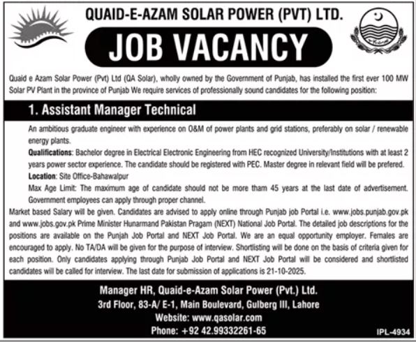 To stay updated about more jobs at Quaid e Azam Solar Power Pvt Limited Lahore, Punjab, in Pakistan, visit the company’s website regularly or follow official job portals.