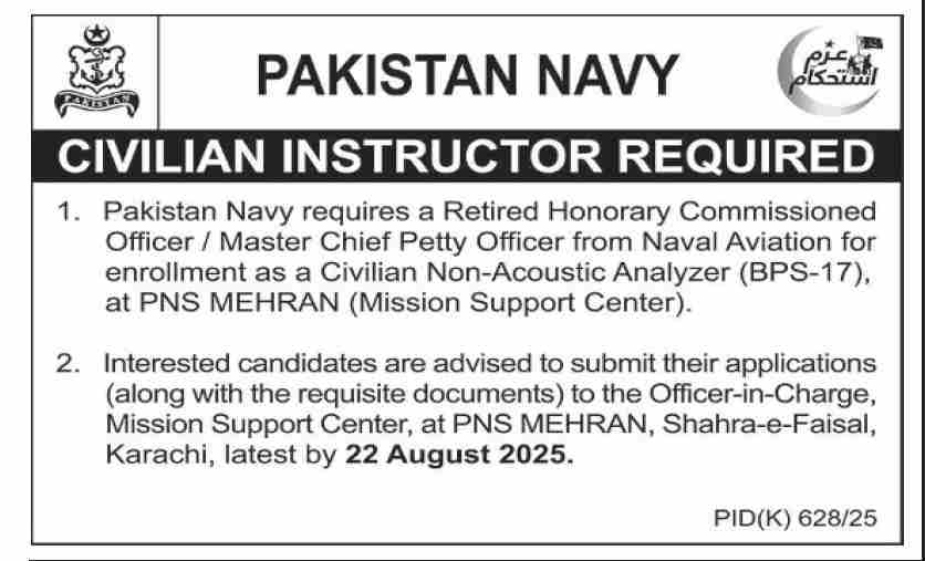 Here are the positions open in the Pakistan Navy for 2025:
