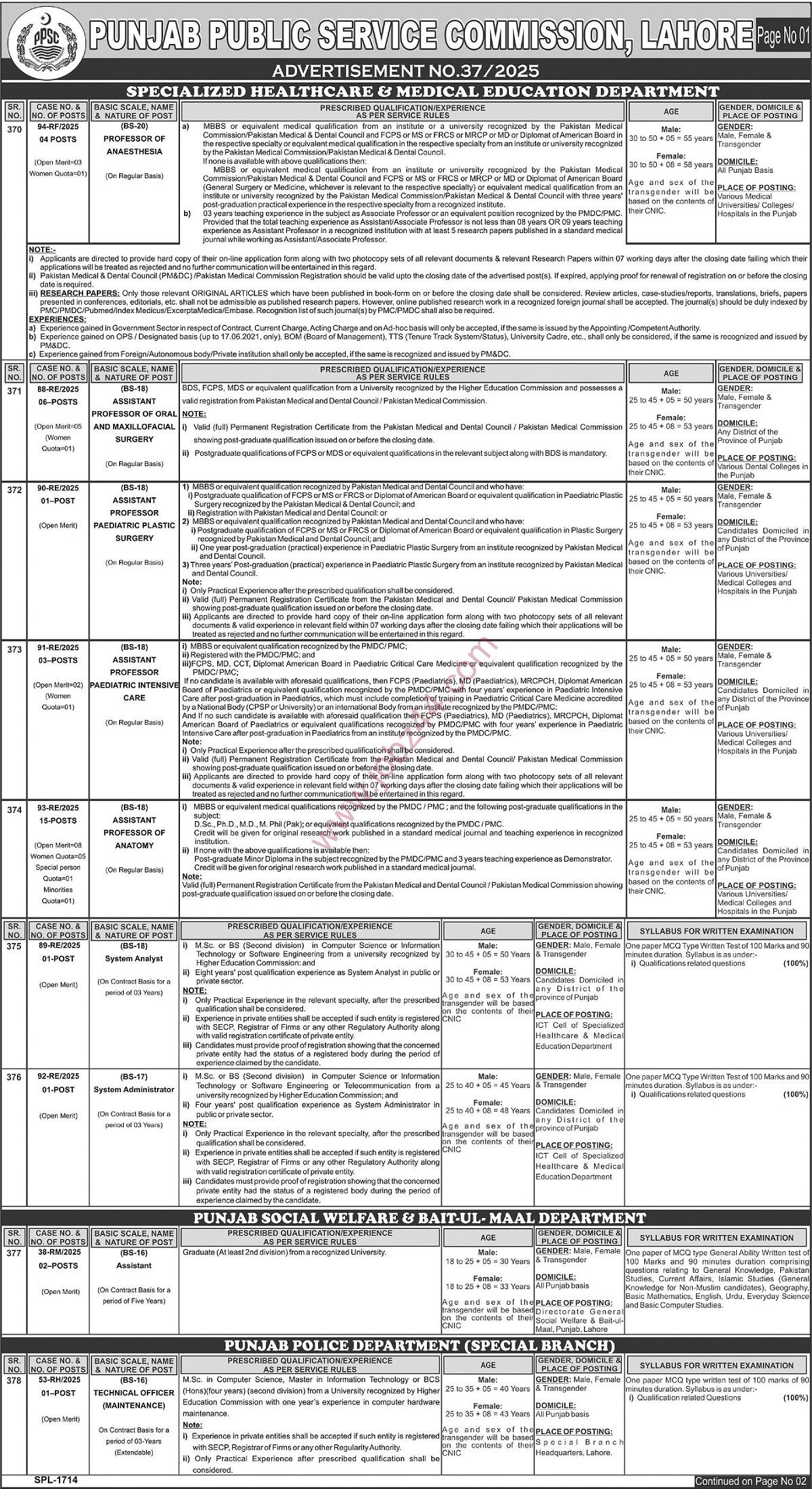 For specialist posts, professional registration with PMDC/PMC is required