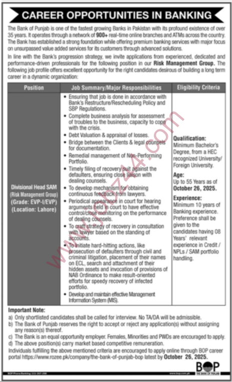 The Bank of Punjab (BOP) – Jobs 2025 in Sialkot, Punjab, Pakistan Full Time